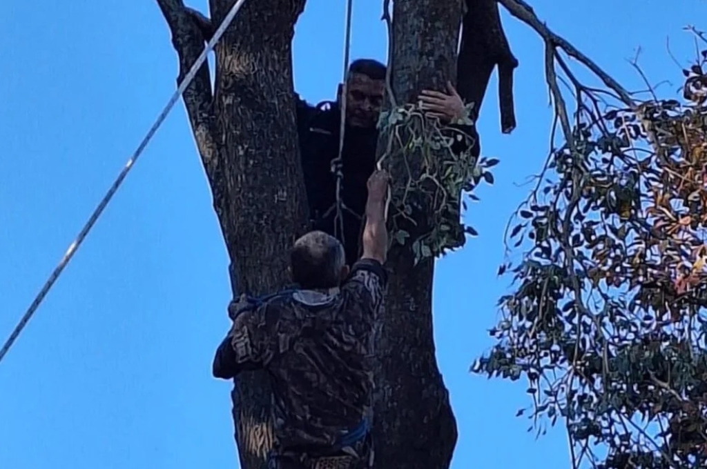 Con elementos improvisados en el lugar, tomaron las cuerdas de sujeción del jardinero para diseñar un arnés de seguridad. Uno de los oficiales ascendió por una escalera y trepó el árbol con maniobras tácticas.