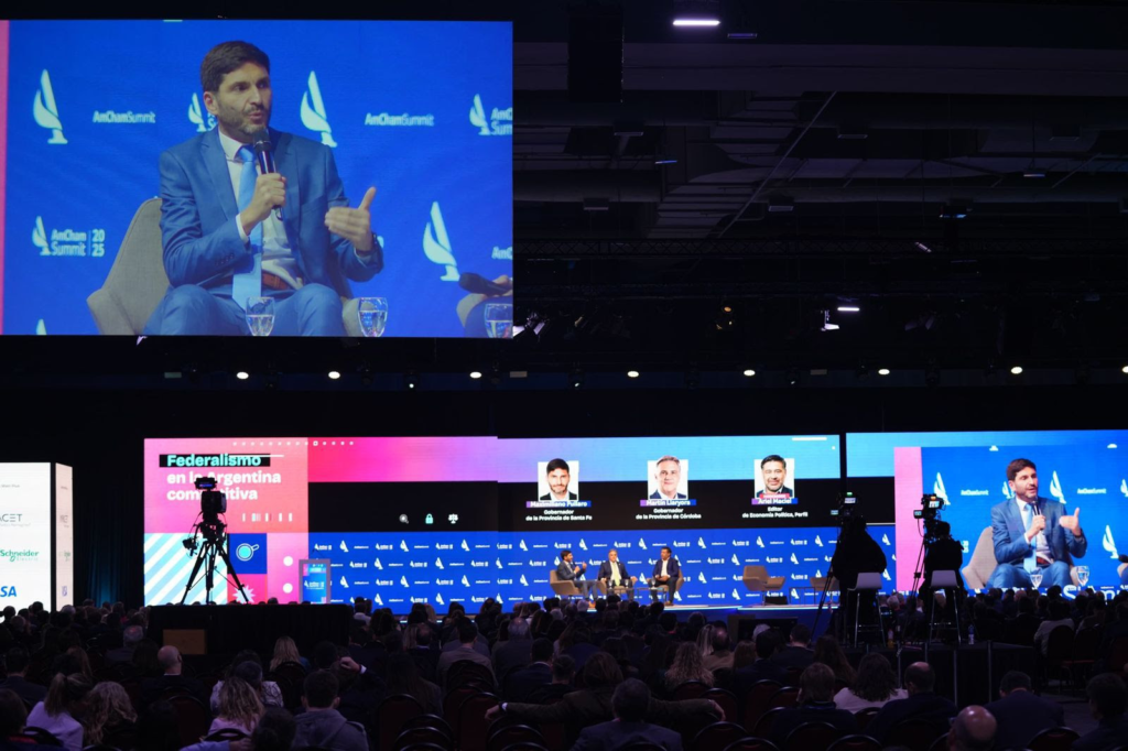 El gobernador de la Provincia de Santa Fe, Maximiliano Pullaro, participó este martes del AmCham Summit 2025. Organizada por la Cámara de Comercio de Estados Unidos en Argentina, esta jornada reúne a importantes referentes del sector público y privado bajo el lema “Una Argentina competitiva”.